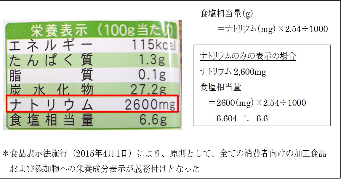 - ナトリウム塩(塩化ナトリウム)を添加していない食品については,食塩相当量に加えてナトリウムの量を表示することができます。その場合,ナトリウムの量の次にカッコ書きで食塩相当量を記載します。