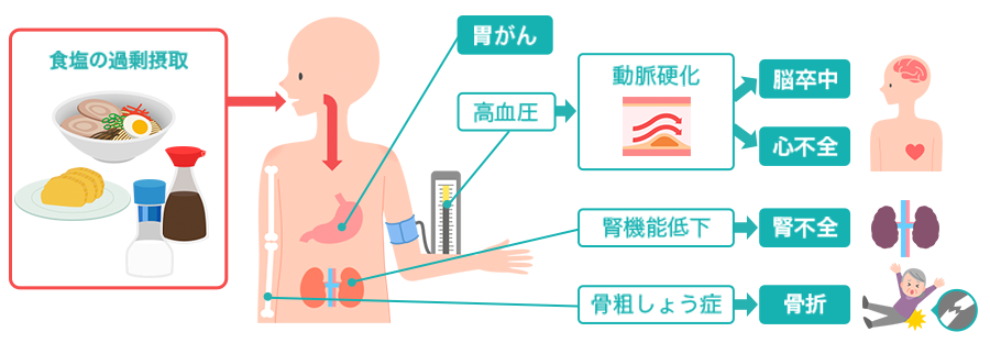 塩分過剰は、食べ過ぎにつながり肥満を招く要因となったり、咽頭や胃がんの一因ともいわれますので、普段から減塩はとても大切です。