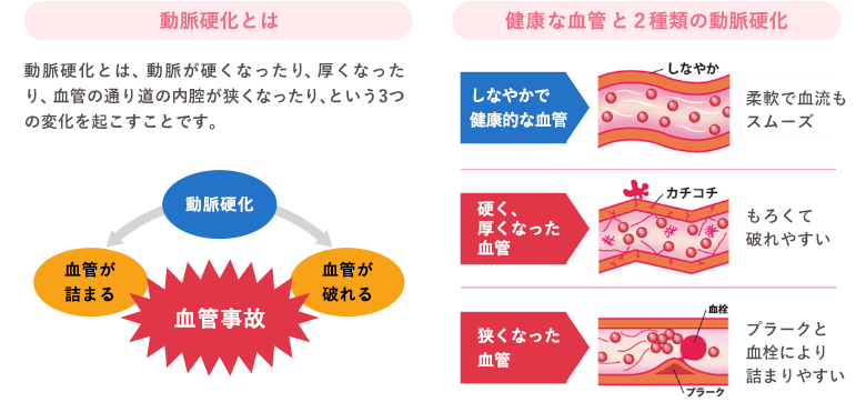 高血圧状態が続くと血管はいつも緊張していて、全身の血管や心臓、腎臓に負担がかかます。そして動脈硬化などを惹き起こします。 動脈硬化でもろくなった血管が破れたり詰まったりすると、脳卒中や心筋梗塞、慢性腎臓病になる恐れがあります。