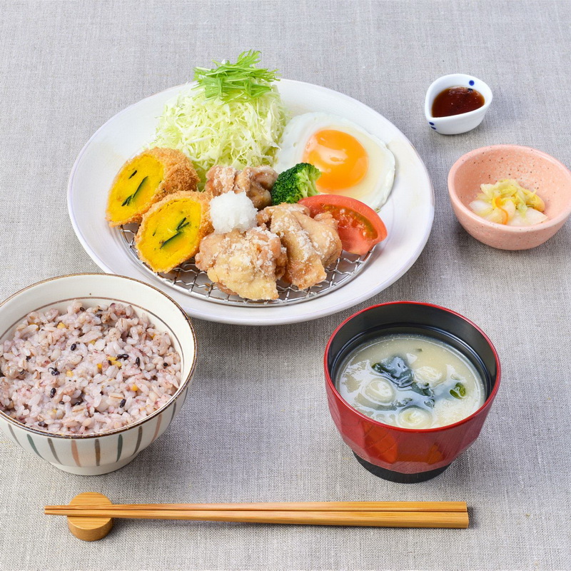 お店のPR:鶏の竜田揚げとほっこり甘いかぼちゃコロッケに、目玉焼きを添えた、バラエティメニュー