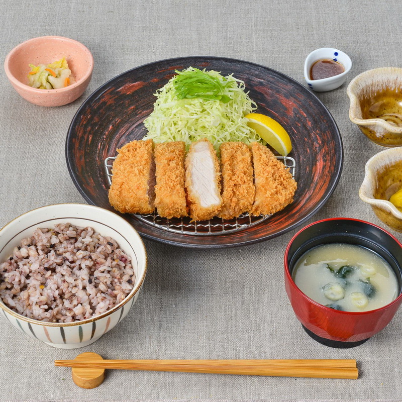 定食:882円(税込:970円) 873kcal 塩分:4.2g 五穀ご飯、味噌汁、お新香、山椒塩からし、和風ドレッシング