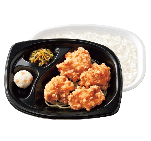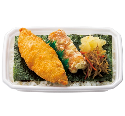 ふっくら炊き上がったごはんの上に、おかか昆布と風味豊かな国産のりをしいて、ちくわの天ぷらと、白身フライをのせています。