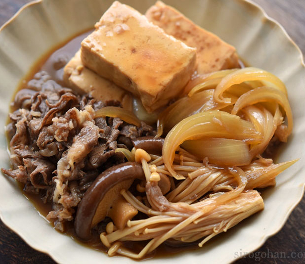 1.牛肉は食べやすい大きさに切る。木綿豆腐は食べやすい大きさに切る。玉ネギは、上下を切り落として皮をむき、縦半分に切り、さらに幅1cmに切る。