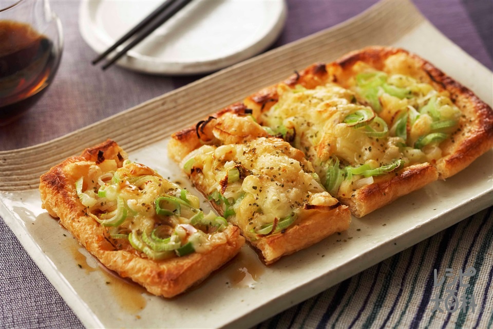 のせて焼くだけでネギとチーズの相乗効果でおいしさアップ。ごま油でカリッと焼いた油揚げに、あつあつチーズがとろり。 香ばしく焼いた油揚げにしょうゆの香りがジュワッとおいしいです。おつまみにもなるスピードメニューです。