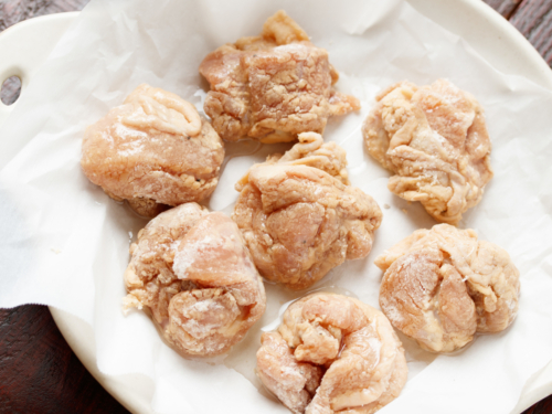 1. 鶏肉は一口大に切りポリ袋に入れ、ダシ調味料を揉込み約15分おく。