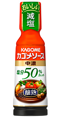 レギュラーソースに対してトマトや醸熟液を増量して、スパイシーさ、旨味、酸味を高めました。スパイシーなのにまろやかなおいしさと塩分50%カットを両立した中濃ソースです。