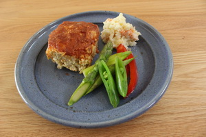 5.食べる分を切り取り器に盛り、付け合わせを置き完成です。