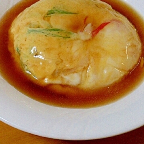 7.卵をお皿にひっくり返し、餡をかけ、ねぎを盛り付けて完成です。