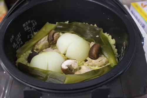 2.具材を乗せたら混ぜずに炊いてください。芯が残る&ベチャベチャの原因になります。