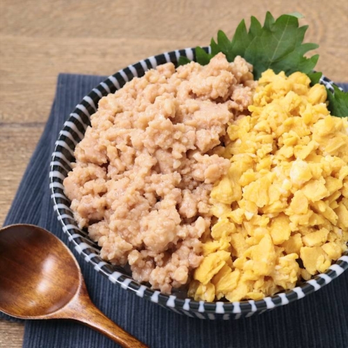 2.鶏そぼろと卵そぼろを、盛り付けて完成です。