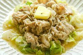 4.大きめのお皿に、キャベツを広げ、豚肉をのせる。