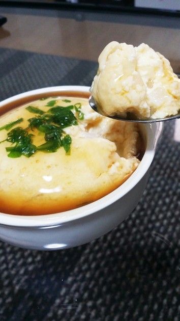 卵と豆腐のふわふわ蒸しです。卵とお豆腐を混ぜてレンジでチンするだけで、簡単に蒸し物ができちゃいます。ご飯にのせて丼にしてもおいしいです。ふわふわ食感の卵に、とろとろのあんをかけて いただく上品な味わいの一品です。火を使わずに短時間で簡単に作れますよ。お好みの具材を加えるとアレンジが広がるので、ぜひお試しくださいね。