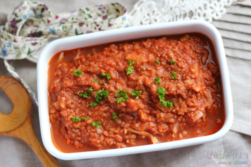 3.トマト缶の水分量が、各メーカーで違いがでるので、トロミが出ないようであれば、小麦粉を大さじ1/2を足して、よく混ぜ合わせて、電子レンジで加熱してください。