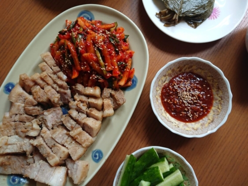 2.出来上がったお肉を、ポッサムのようにキムチや味噌サムジャンを添えて食べたり、野菜に巻いて食べると美味しいです。意外とお店のような味に近く作れる料理なので、おすすめです。