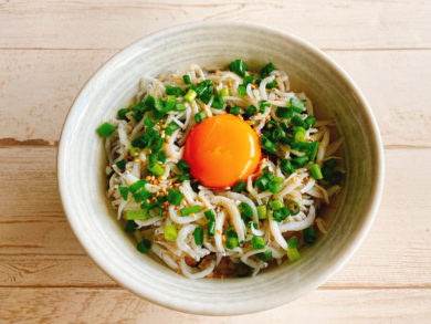 5.小丼に生卵を割って乗せ、お好みで万能ねぎを散らしたら完成です。