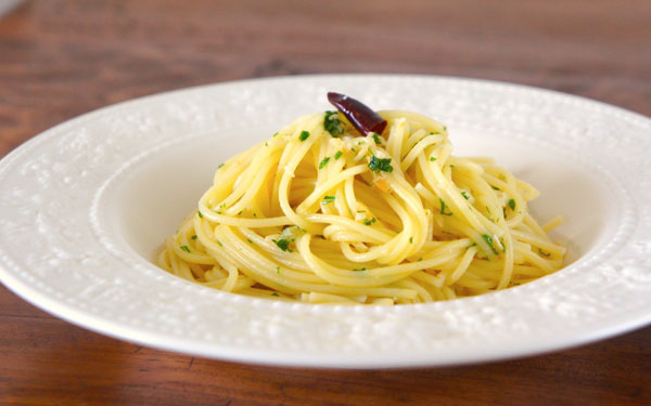 ナポリを起源とする、もっともシンプルでベーシックなパスタ料理の一品です。 イタリア語で、アーリオはニンニク、オーリオは油、ペペロンはトウガラシを意味し、塩ゆでしたスパゲティをにんにくとオリーブオイルだけで調味したものをスパゲティ・アーリオ・オーリオ、これに唐辛子を加えたものをスパゲティ・アーリオ・オーリオ・ペペロンチーノと呼びます。