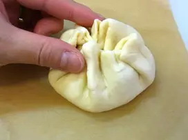 6.生地を中央にまとめ、ひだを寄せながら包み、合わせ目を閉じる。