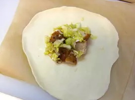 5.15cmくらいに伸ばし生地の中心に、具の1/4の量を乗せる。