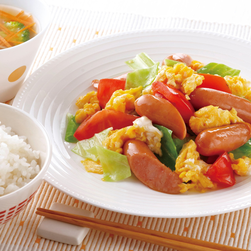 ウインナーのレンジトマト煮です。レンジで加熱したトマトをほどよくくずして、香りのよいウインナーとともに食します。加熱した食材に調味料を絡めるだけなので、バタバタしがちな朝食にもぴったりです。ウインナーソーセージが入るので食べ応えもバッチリで、トマトの酸味があと引くおいしさです。