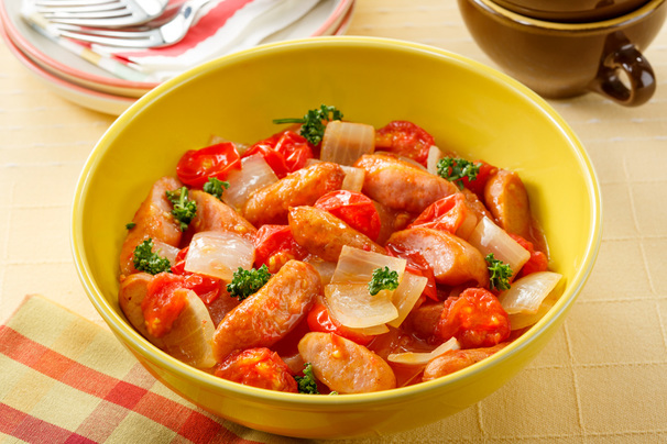 ウインナーのレンジトマト煮です。レンジで加熱したトマトをほどよくくずして、香りのよいウインナーとともに食します。加熱した食材に調味料を絡めるだけなので、バタバタしがちな朝食にもぴったりです。ウインナーソーセージが入るので食べ応えもバッチリで、トマトの酸味があと引くおいしさです。