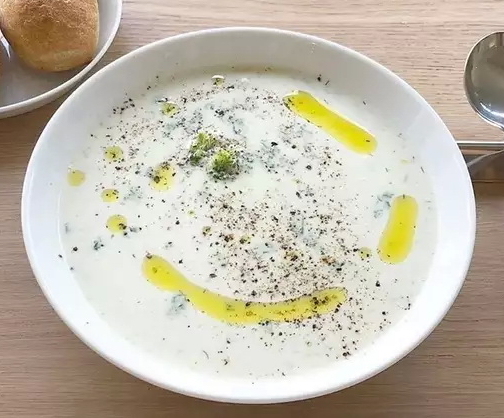 「ビシソワーズ」:じゃがいもの冷製クリームスープ。じゃがいもとポロねぎを炒めてブイヨンで煮込み、裏ごしして生クリームを加えたもの。1917年にホテル、ザ・リッツ・カールトン ニューヨークの料理長だったルイ・ディアが、幼ない頃母親が作ってくれた冷製スープをヒントに考案し、彼の母親の故郷フランスのビシーにちなんでこの名がつけられたとされる。