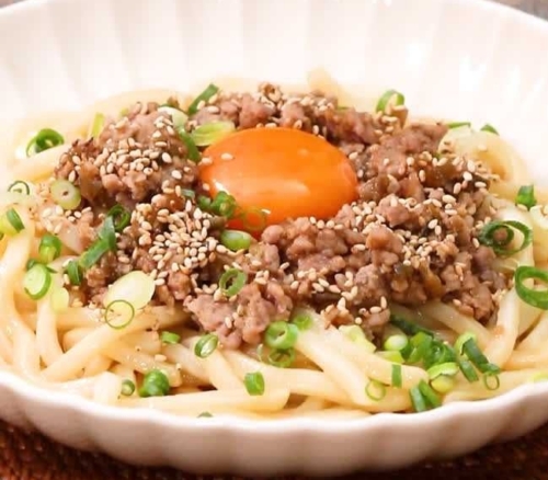 レンジで作る「汁なしピリ辛担々うどん」のレシピです。辛さが決め手の坦々うどんですが、ニンニクとごまがたっぷりな味付けと、豊かな香りを楽しんでください。卵黄のクリーミーさとピリ辛の豚ひき肉との相性が抜群です。火を使わずにレンジであっという間に美味しく作れる、担々麺風の冷しうどん、夏の暑い日に最適です。ぜひお試しください。