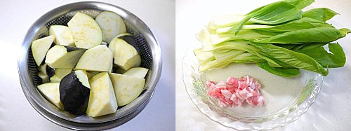 - 茄子はヘタを切り取り、一口大の乱切りにします。