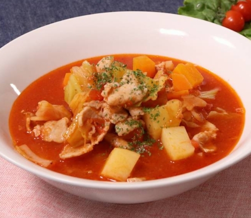 冷蔵庫の余った野菜で出来る、具だくさんのミネストローネ風のスープです。野菜を多く入れているので、野菜のうまみたっぷりのトマトスープです。食べ過ぎた次の日は、トマトスープで調整しても良いですね。具がたくさん入っているので、かなり満足できる一品。お手軽スープは簡単だけども栄養も取りたい方にうってつけです。ぜひ、お試しください。