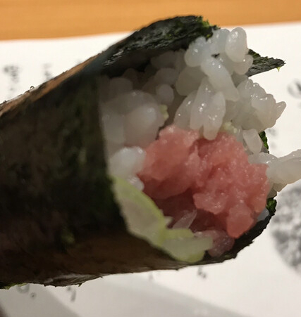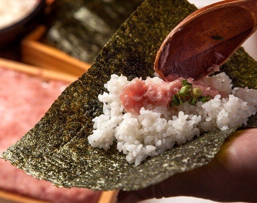 - 焼きのりに、酢飯50g程度を広げ、ネギトロ25gを中に入れます。