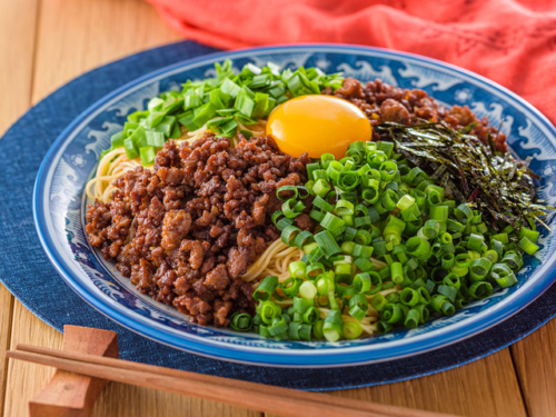 台湾まぜそばをそうめんでアレンジした「台湾まぜそば風冷やしそうめん」のご紹介です。ニンニクとタマネギ入りの甘辛く味付けした豚そぼろと、万能ねぎ、卵黄が味の決め手です。クセになるおいしさですよ。よく混ぜてお召し上がりくださいね。ぜひ、お試しください。