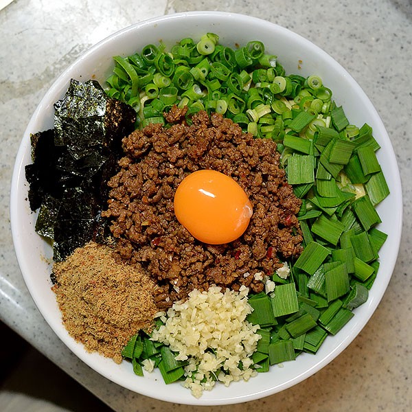 - ひき肉、万能ネギ、刻み海苔、卵黄を乗せて完成です。