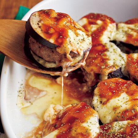 - 耐熱皿に、なす2切れで肉だね適量をはさみ、並べ入れる。