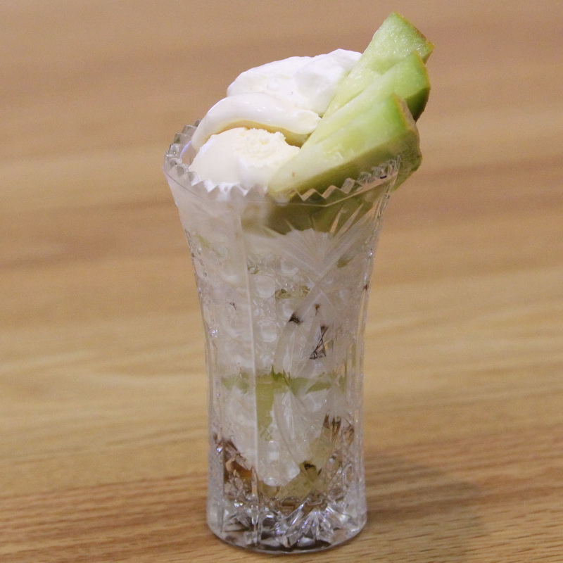 - グラスのふちにかかるように、皮付きのメロンをトッピングする。